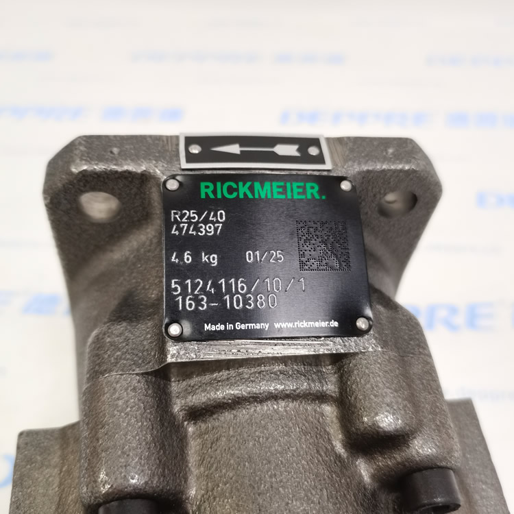 RICKMEIER R25/40 F474397系列齒輪泵是德國瑞克梅爾(RICKMEIER)公司設(shè)計的工業(yè)用液壓泵,專為輸送潤滑油、燃料油及低腐蝕性油基介質(zhì)而優(yōu)化。該泵采用模塊化三部分式外殼結(jié)構(gòu)(灰鑄鐵材質(zhì)),齒輪組件為淬火鋼,兼具高剛性與耐磨性。標(biāo)準(zhǔn)型號為R25/40 FL-M-G1-R-SO(或R25/40 FL-M-G1-R-60),其中“G1”表示進(jìn)出口螺紋規(guī)格,“R”代表右旋設(shè)計(從驅(qū)動軸端觀察為順時針旋轉(zhuǎn))。最大排量40(單位未明確,推測為cm3/rev或L/min),適用溫度范圍-20°C至+80°C(瞬時峰值≤120°C)。